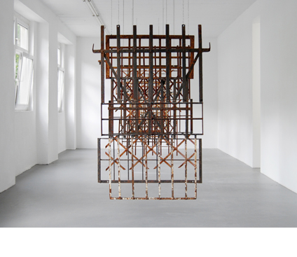 Lazy Mans Guide to Enlightenment Nine found window and door grilles are each divided into three equal parts and welded together rearranged. The recombined elements are hung in a line at 1m intervals along a space. Dimensions variable 2011